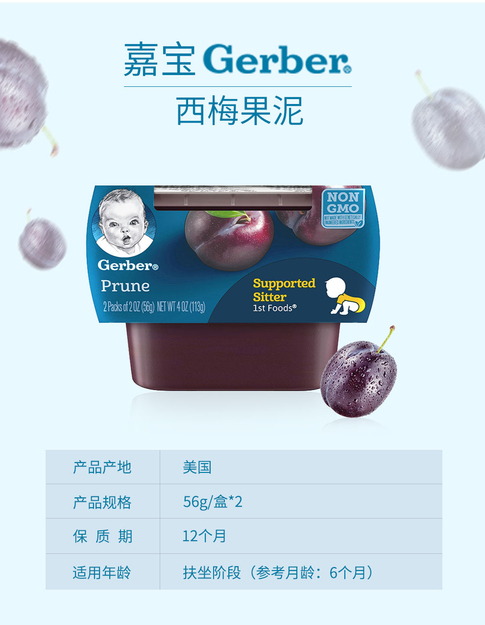 商品名称:嘉宝(Gerber)西梅泥 美国进口婴儿宝宝辅食水果泥 【1段】西梅泥8*56g/盒 商品编号:1994843985 店铺: 牛津妈妈海外专营店 商品毛重:300.00g 产品产地:欧美 国产/进口:进口 分类:果泥 适用年龄:4-6个月 包装单位:瓶装
